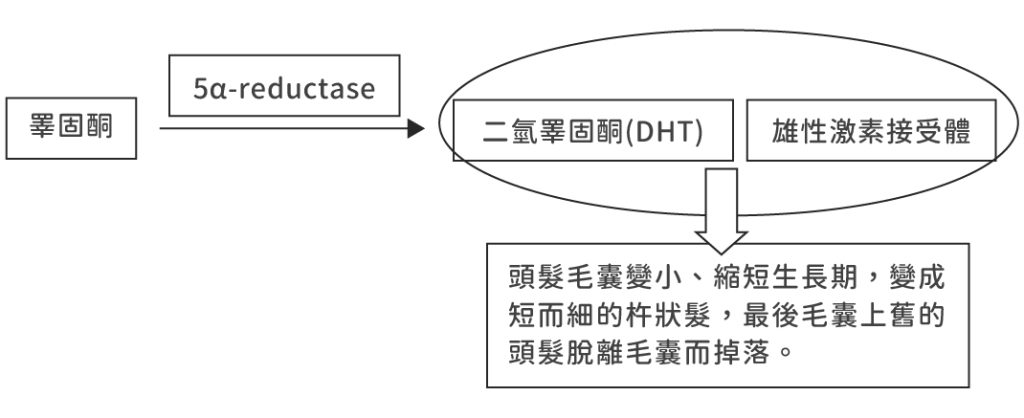 雄性禿為多基因遺傳疾病,一般認為是因身體週邊的 5α-reductase將睪固酮轉變為效能更強的雄性激素「二氫睪固酮(DHT)」與頭皮上的雄性激素接受體結合後,引起。