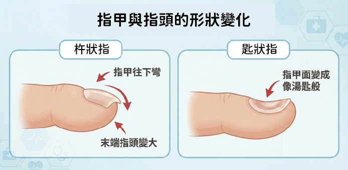 末端指節圓鼓、指甲呈拱形(杵狀指)
