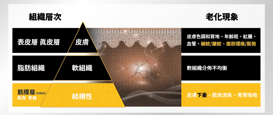 讓皮膚有彈性的是膠原蛋白,是支撐表皮與皮下組織的彈簧;SMAS筋膜層則是連結面部淺層肌肉與脂肪的一層結締組織薄膜,是皮膚的地基。兩者因老化而失去支撐力,臉部慢慢出現皺紋、失去彈性、鬆弛下垂,以上皮膚老化現象都可以透過音波能量來達到改善。