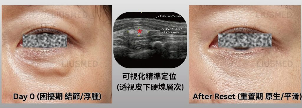 - 處理方式: 若確認為純玻尿酸,可使用高濃度降解酶。但若玻尿酸周圍已形成厚重包膜或纖維化,單靠降解酶效果有限,仍需配合微創處理將纖維化組織鬆解。