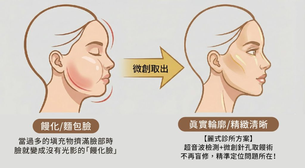 面對填充失敗的硬塊或「饅化」現象,並不只有單一修復方式,麗式診所會依照您饅化、硬塊的嚴重程度,規劃適合您的修復方案。