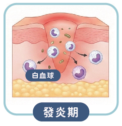 • 特徵:血管收縮形成血栓,減少出血。隨後血管擴張,白血球和其他免疫細胞進入傷口區域,以清除細菌和死亡的細胞。這一階段通常伴隨著紅腫、熱感、疼痛和功能受損。