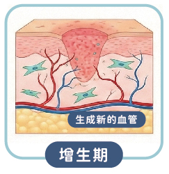 • 特徵:傷口底部的纖維組織開始增生,形成新的血管(血管生成)和新的結締組織(纖維蛋白)。這一階段的目標是填補傷口,形成初步的結締組織。表面上,傷口邊緣開始合攏,並形成薄的表皮。