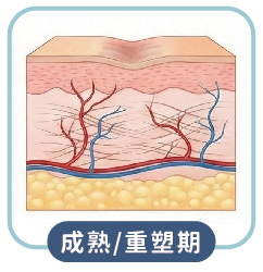 • 特徵:增生階段中的結締組織進一步增強和重組,以提高傷口強度。結締組織可能會縮小,並最終形成更強大、結實的結疤組織。表皮繼續修復和增強,傷口外觀逐漸變得更自然。