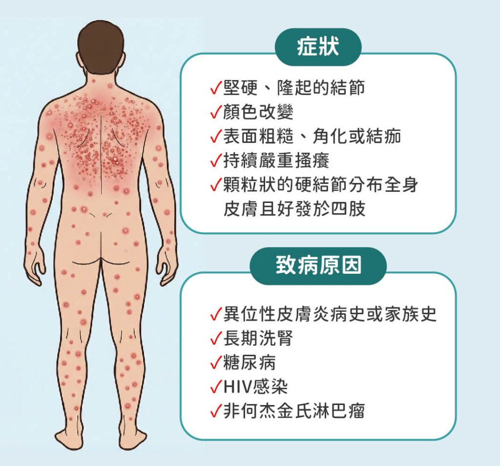 - 表面粗糙、角化或結痂:因長期搔抓,結節表面常出現脫屑、結痂、裂傷,甚至滲血。