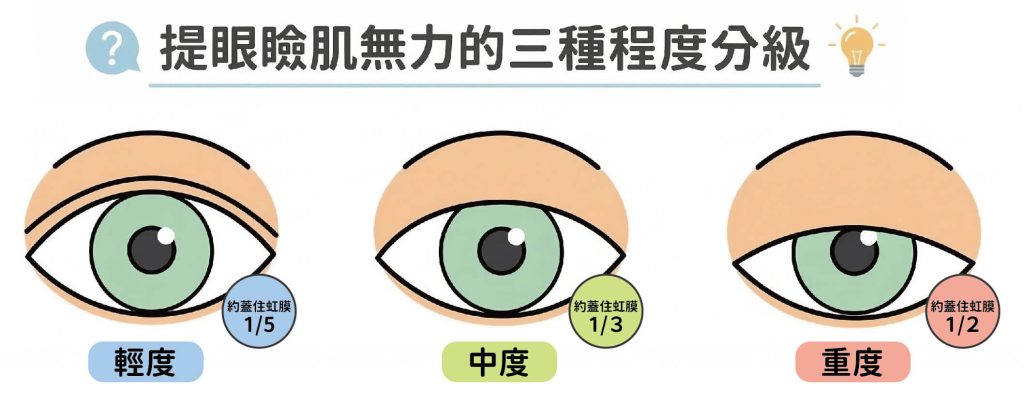 - 重度:眼皮蓋住虹膜上緣距離大於5mm(約蓋住虹膜1/2)。