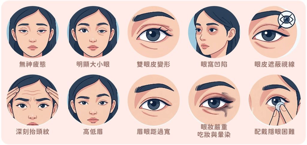 - 雙眼皮變形:原本的雙眼皮變寬、變淺,或因皮膚鬆弛堆疊出現「多層眼皮」。