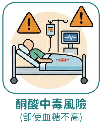 - 酮酸中毒 (DKA):雖然少見,但在特定壓力情況下(如生病、手術)可能發生,即使血糖不高也要留意。