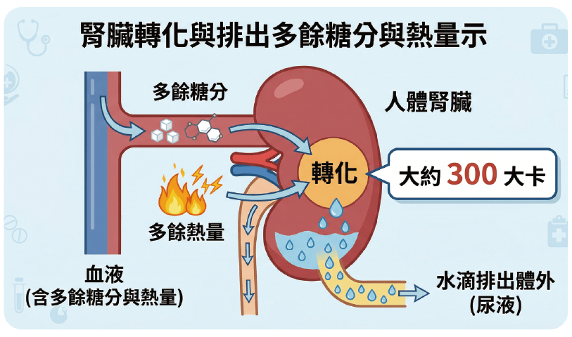 福適佳的作用就是告訴腎臟:「糖太多了,別回收那麼多,讓一部分從尿液排出去吧!」排出去的糖分其實就是熱量!當身體每天透過尿液多排掉一些熱量(大約300大卡)、水分和鈉含量,日積月累下,體重自然就可能跟著下降了。這有點像是幫身體開了一個「熱量排水孔」,讓多餘的負擔順水流走。